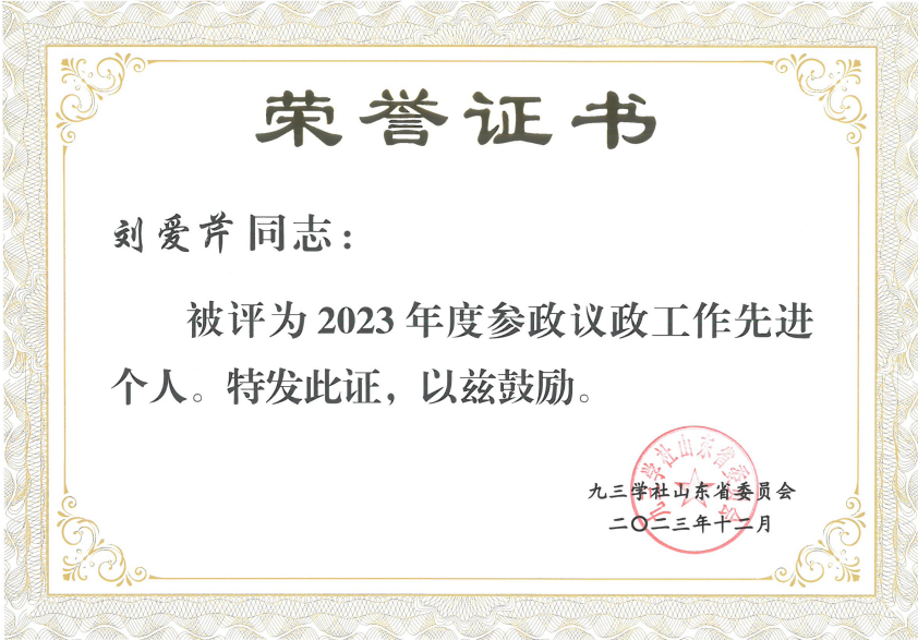 刘爱芹教授获九三学社山东省委员会荣誉表彰