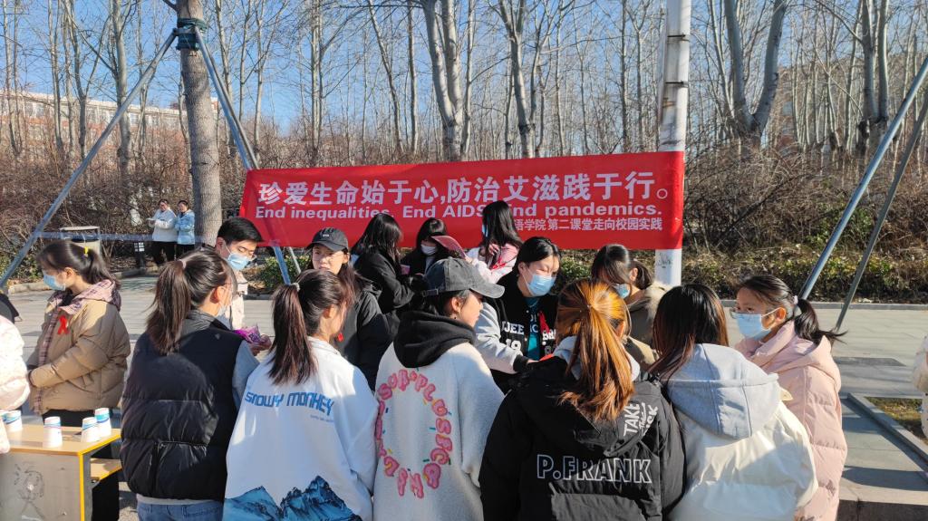为落实综合育人理念,激发学生英语学习热情,推动学生全面发展,12月1日,外国语学院于一餐岔路口处成功开展“向零艾滋迈进 Getting to zero”第二课堂教学实践活动。外国语学院院长宋秀葵,团总支书记牛荦,教师邹德平莅临活动现场,2021级英语(师范类)专业班级全体学生在邹德平老师的带领下策划设计并实施了此次的第二课堂。