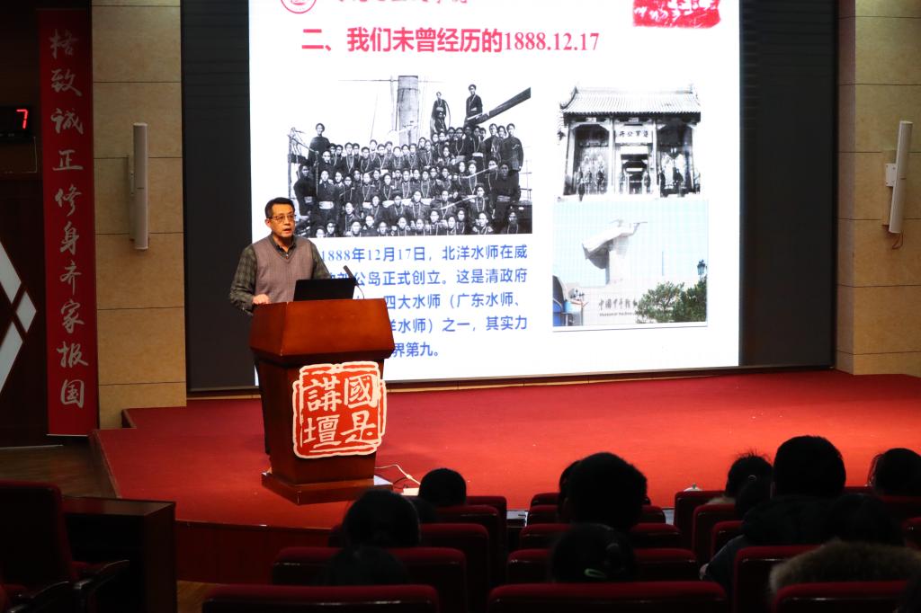 讲座共分为“我们所经历的2019.12.17”、“我们未曾经历的1888.12.17”和“我们的‘航母’之路”三部分,分别由李倩同学、刘振光教授和赵欣副教授讲解。讲座中,刘振光教授首先指出“1888.12.17”为北洋水师建立之日,并带领大家重温了北洋水师由创建、兴盛到全军覆没的历史过程,通过近代中日海军力量对比的悬殊差距突出了改革的重要性,勉励当代青年大学生树立危机感、责任感和使命感,告诫其要铭记历史、面向未来、珍爱和平,要为实现中华民族伟大复兴大任贡献青春力量。刘院长用“向海而兴、背海而衰,不能制海、必为海制,禁海几亡、开海则强”24字小结结束了本部分讲解,并号召广大师院青年要以马克思主义思想为指导,坚持中国共产党的领导,坚持中国特色社会主义制度,坚持走中国特色社会主义道路。