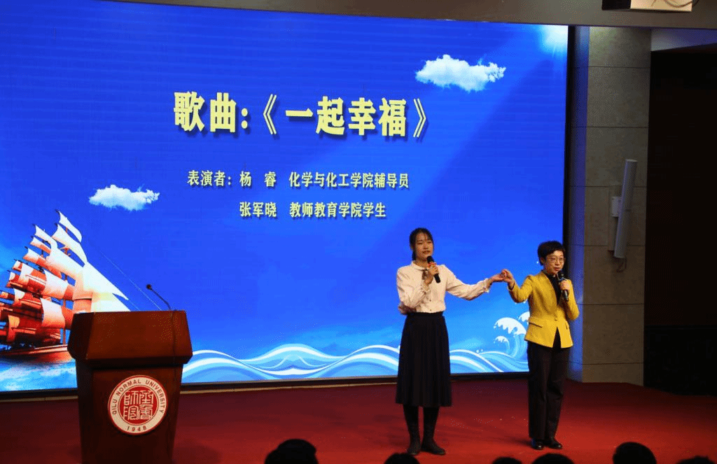 化学与化工学院辅导员杨睿老师与教师教育学院学生张军晓表演的情景朗诵《为爱护航》及歌曲《一起幸福》,道出了师生之间的温情与关爱,展现了3200威尼斯vip扶危助困、崇德向善的良好校园风尚。