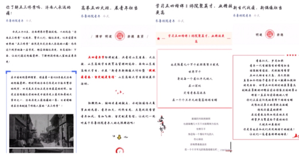 深度剖析偶像,青年有目标。4月19日,威尼斯官网开展了“新青年新偶像大讨论暨‘绽放战疫青春•坚定制度自信’3200威尼斯vip大学生演讲展示活动”,共征得各学院优秀演讲视频近30份。活动潜移默化地影响着青年人的偶像观、价值观、成才观,激励和引领青年进一步坚定制度自信,投身党和人民最需要的地方发热放光,推崇英雄、崇尚担当、向往奉献的正能量在青年人心底慢慢积聚成塔。此外,校团委借助官方微信、微博等媒体平台陆续推送了《你了解五三惨案吗?济南人永远的痛》、《新声代战疫,新偶像担当》、《学习五四榜样‖师院聚英才,业精技更高》、《高举五四火炬,展青年担当》等文章,旨在激励学校广大青年志以成学,业精于诚,以身边的偶像为榜样,扎实理论功底,提高专业素养,在真抓实干中磨炼实践本领。