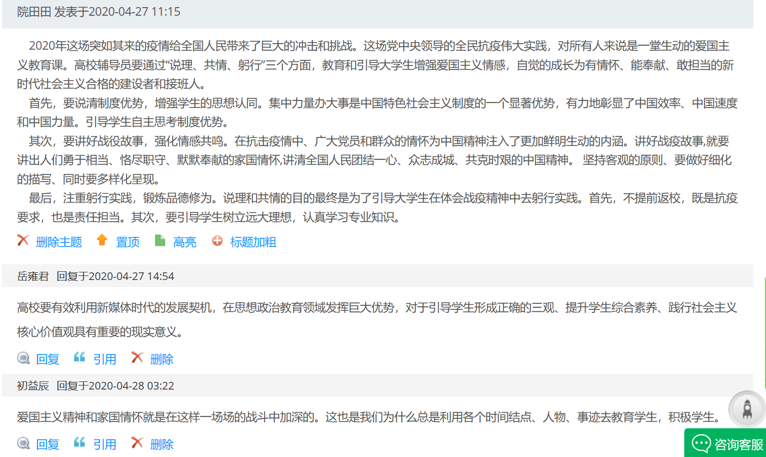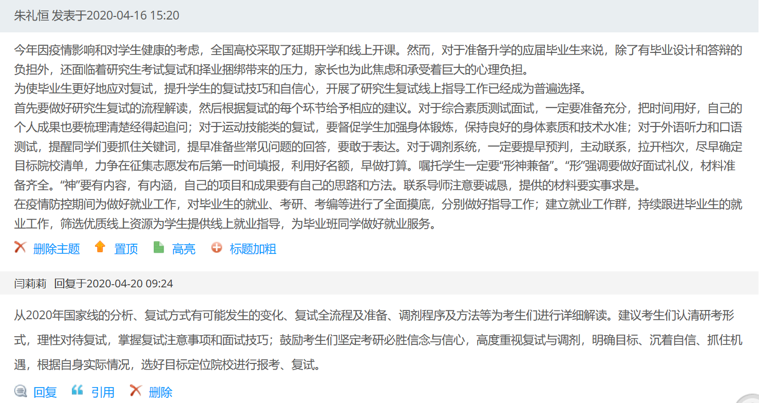 音乐学院党总支副书记马艳:面对突如其来的新冠肺炎疫情,很多人的学习、工作方式都随之发生了改变,辅导员的学生教育工作也是如此。面对学生教育工作从线上线下结合向完全线上形式的转变,我们也要及时转换工作思路,去学习利用互联网开展学生教育工作。心有大我,责任在肩。疫情面前,每个人都是战斗者、奋斗者,都应各尽其责、有所担当,而越是艰难的考验,越会让我们快速成长。我也将以此次培训学习为工作契机,开拓各种渠道加强对学生的思想政治教育工作,树立学生的社会责任感和担当意识,引导学生完成蜕变,成为有理想、有本领、有担当的社会主义合格建设者和可靠接班人!