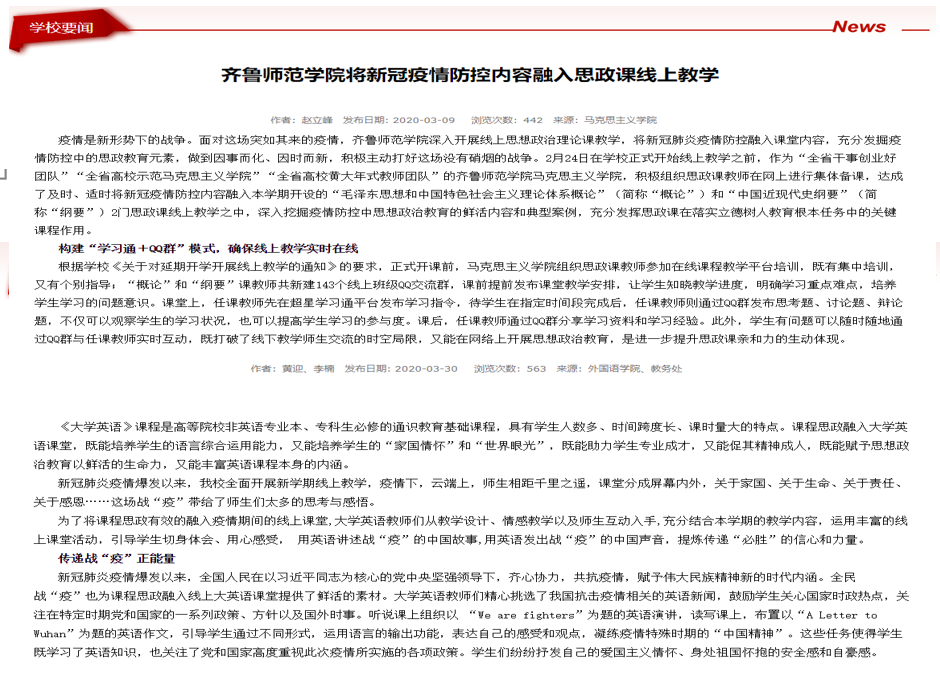 1.重视课程思政建设,深入挖掘疫情防控中思想政治教育的鲜活内容和典型案例,充分发挥思政课在落实立德树人教育根本任务中的关键课程作用。把疫情防控工作中的生动实践变成课堂教学的丰富内容,实现课程的知识传授、能力培养与价值引领有机融合,给学生传递正能量。