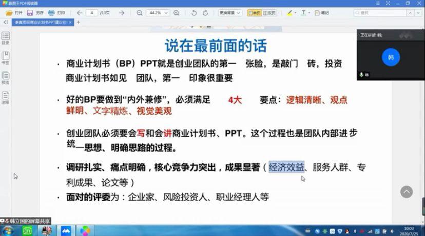 7月25日上午,在各学院参赛选手提交项目申请书后,学校特邀济南工程职业技术学院工程管理学院党总支副书记,省赛金奖指导教师韩立国副教授通过腾讯会议室远程指导,会议由学生工作处(部)副部长、就业指导中心主任阴小建主持,各学院团总支书记、辅导员、推荐项目的指导老师和团队负责人、参与创业大赛老师和同学800余人参会聆听。会上,韩教授重点讲解了参赛PPT和商业计划书的制作,并对今年部分参赛项目进行重点点评。会议反响热烈,会后各参赛团队积极完善修改参赛项目。