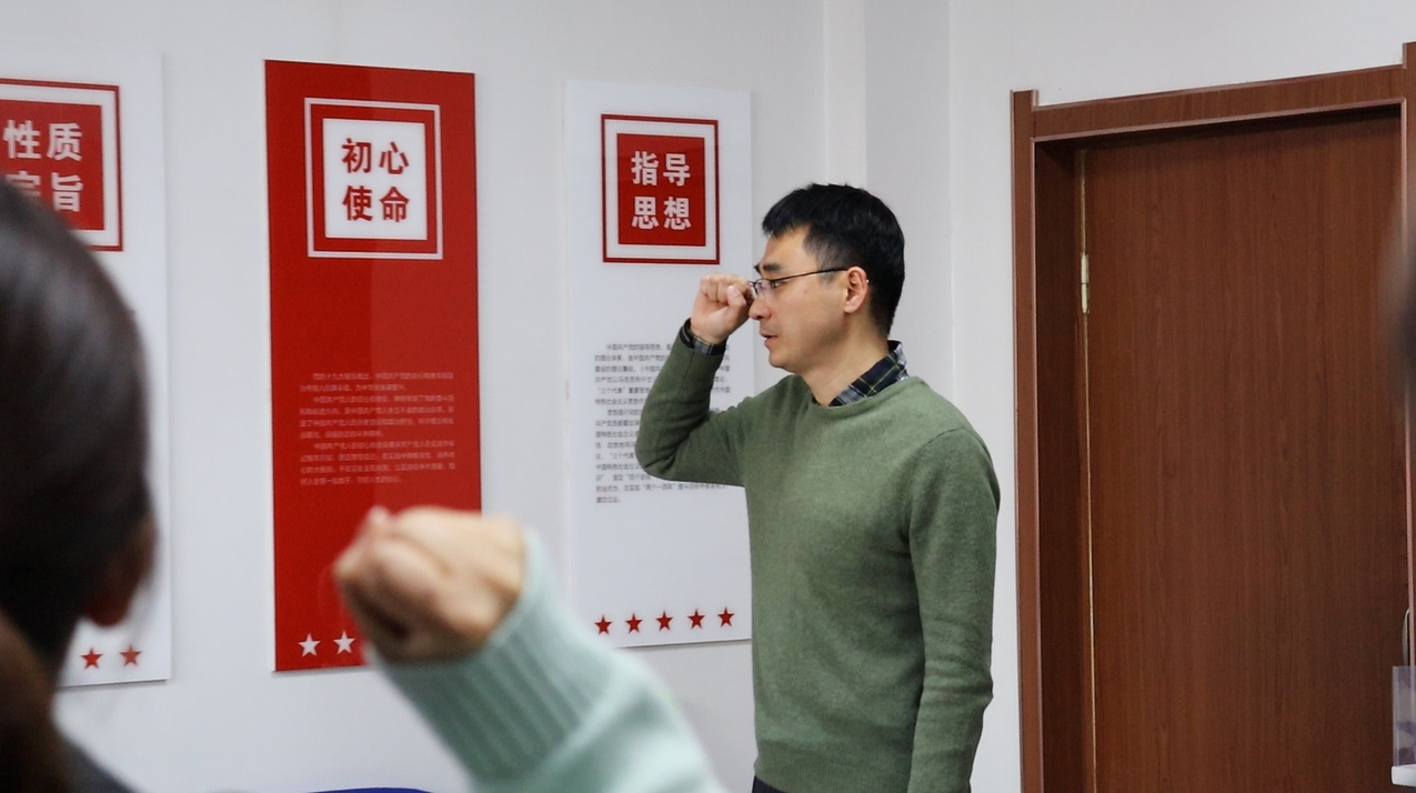 化学与化工学院团总支书记巩磊带领全体党员重温入党誓词。当成为预备党员,举起右拳面对党旗庄严宣誓的那一刻, 就意味着自己政治生命的开始,用铮铮誓言彰显永恒初心。