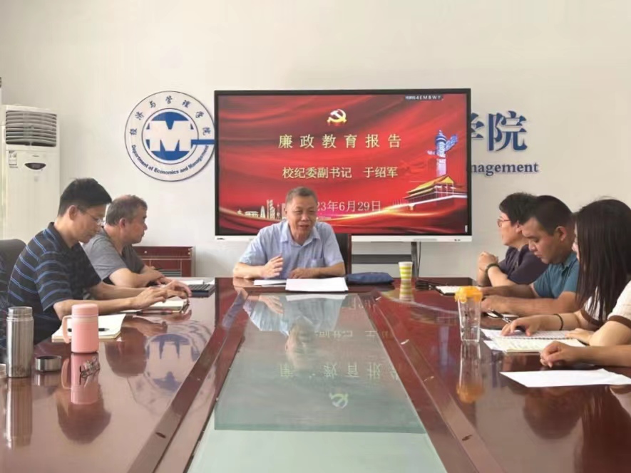 为扎实推进学习贯彻习近平新时代中国特色社会主义思想主题教育走深走实,强化党风廉政教育,筑牢党员干部反腐倡廉思想防线,6月29日下午,学校纪委副书记于绍军到经济与管理学院为全体教师党员作廉政教育报告。经济与管理学院党委书记杨自旗、院长周健、党委副书记吴立伟及全体教师党员参加报告会。
