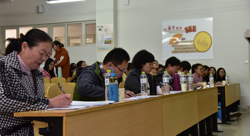 为培养学生阅读经典古诗文的兴趣,夯实小学教育专业学生的专业基础知识,教师教育学院于2017年11月16日下午在一号教学楼A111教室举办了以“诵读中华经典,营造书香校园”为主题的小学教育专业第二届挑战古诗词大赛。本次大赛由王维教授主持,刘文华教授、姚国教授、滕秀芹副教授和孙岩博士担任评委。2016级小学教育免费师范生全体同学参加比赛。