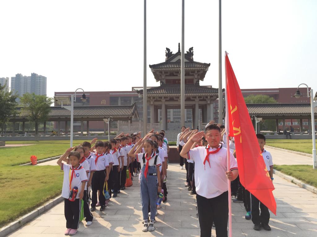 上午九点,少儿英语学校学生们乘坐校车到学校,满是热情,在我院青年志愿者带领下到达文化长廊,历史与社会发展学院金声解说团的志愿者们为他们讲解长廊石碑上的名人名事。随后数学学院学生组织小学生在国旗台下齐声高唱国歌,在图书馆前歌唱《我和我的祖国》和为小学生系红领巾活动。最后我院志愿者带领小学生们参观了大学生军训,军训教官教小朋友们标准的敬礼手势并细心纠正,使小学生们发自肺腑地热爱祖国、崇尚军人和憧憬大学生活。