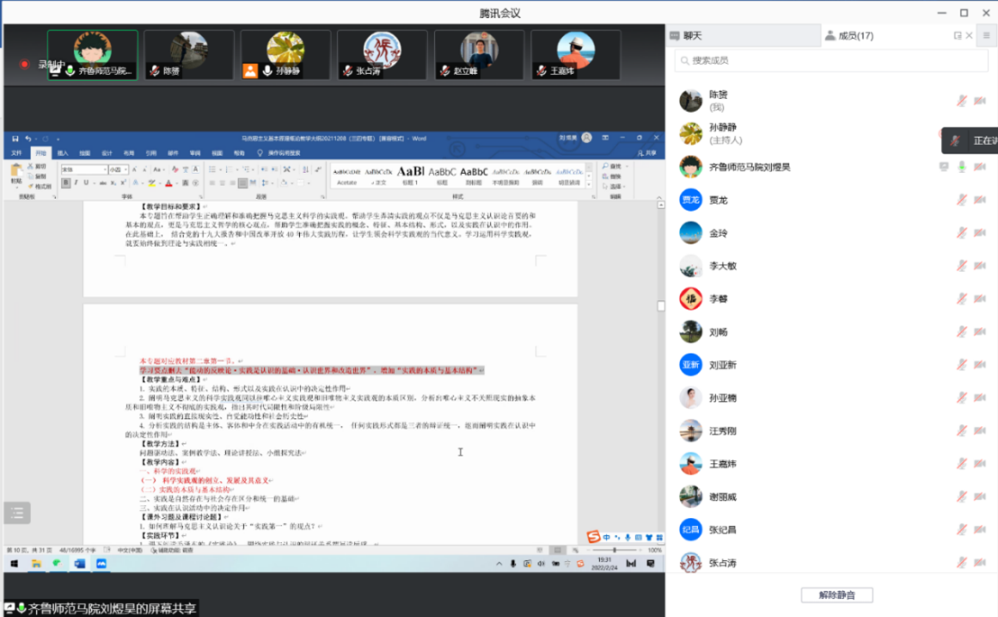 为深入学习贯彻党的十九届六中全会精神,持续推动思政课教学改革创新,提高教育教学质量,2月24日,马克思主义学院“马克思主义基本原理”教研室围绕2021版新教材召开新学期集体备课会。会议由教研室主任孙静静副教授主持,教研室全体教师参加会议。